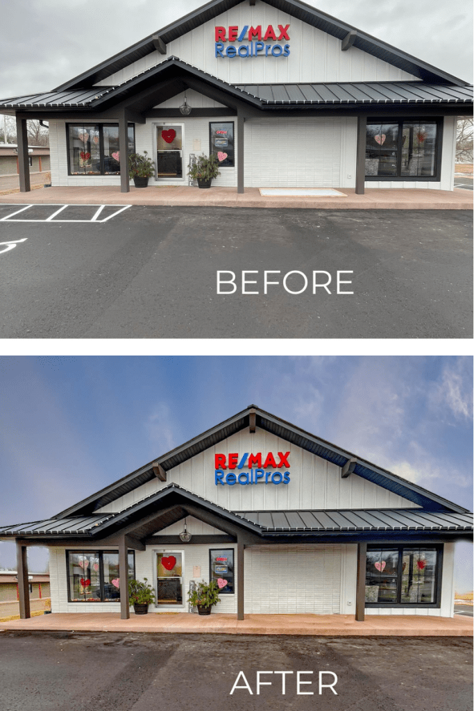 Wow factor right? Don’t settle for an agent that just takes cell phone photos. You deserve someone that has invested in technology so you get the most robust marketing possible. Take a look at the before and after photos below. Notice how the Before photo was taken on a gray, cloudy day. In the After photo I’ve brightened the sky, removed some distractions like the white lines on the parking lot, the white square on the front stoop and the trees in the background. Your eye is drawn to the our office building and not distracted by the clutter around it.